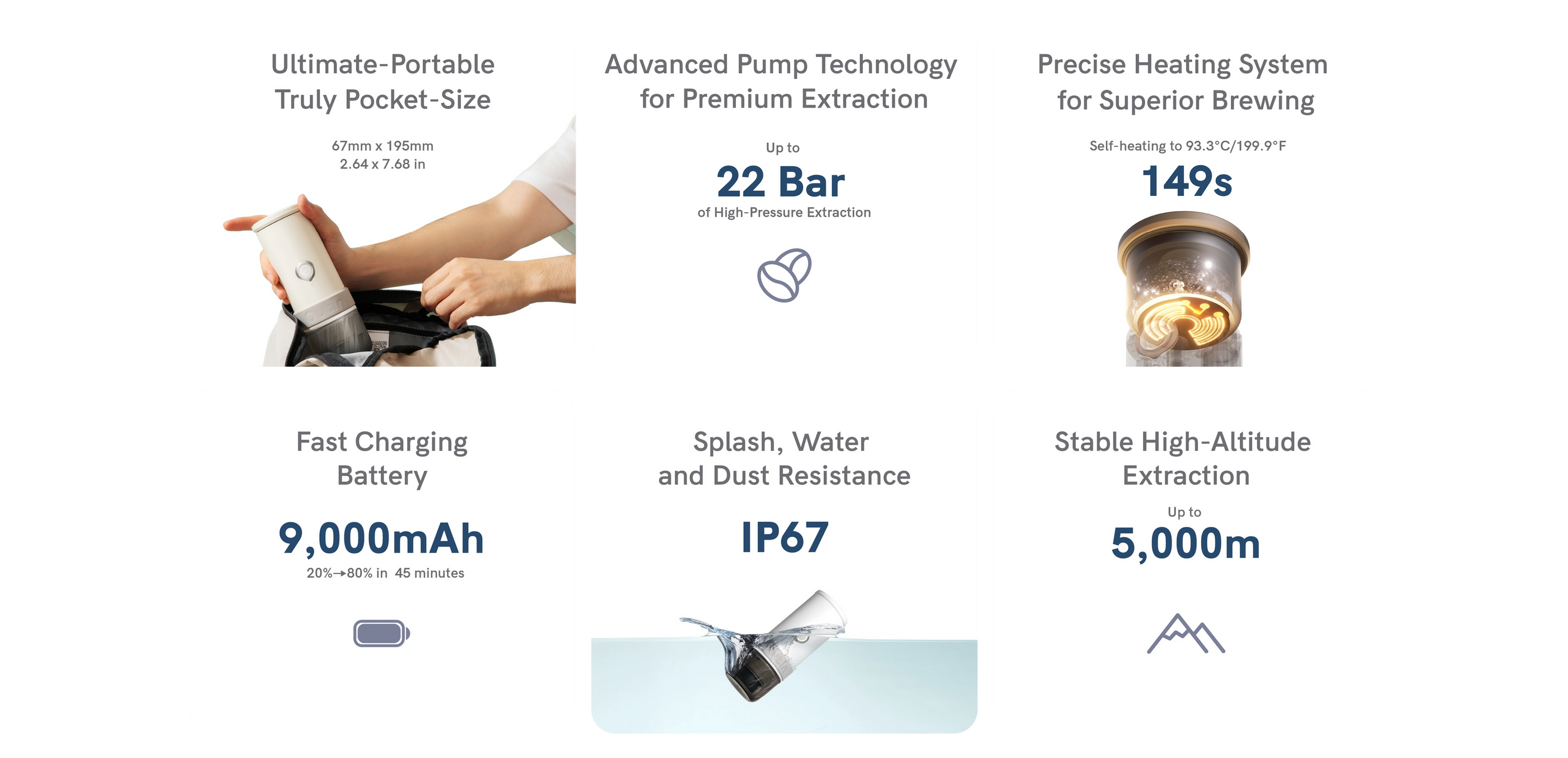 • Eventyrklart Design: Bygget for de aktive – fra hjemmet til fjelltopper. Med IP67-beskyttelse mot vann, støv og sprut samt stabil ekstraksjon opptil 5.000 meters høyde.